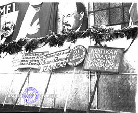 Item VI.53.0207 - Rapat Raksasa di Tambakrejo Simokerto, tampak poster-poster yang dilarang) seperti foto karl mark (Karl Marx : Bapak Pencetus Paham Sosialis Dunia) dan Vladimir Lenin : Penggerak Revolusi Uni Soviet sekarang : Russia), dalam peringatan hari buruh di Surabaya, seperti foto karl mark dan Vladimir Lenin dan berbagai sepanduk dan tulisan seperti “BATALKAN PERJANDJIAN KMB”, “SELESAIKAN DENGAN SEGERA PERISTIWA 17 OKT 1952 (Peristiwa 17 Oktober 1952 adalah peristiwa di mana KSAD (dijabat A.H. Nasution) dan tujuh panglima daerah meminta Dewan Perwakilan Rakyat Sementara (DPRS) dibubarkan. Kemal Idris, salah satu dari tujuh panglima, pernah mengarahkan moncong meriam ke Istana. Dalihnya melindungi Presiden Soekarno dari demonstrasi mahasiswa, sb:wikipedia)”, 1 – 5 – 1953