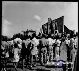 Rapat Raksasa di Tambakrejo Simokerto, tampak poster-poster yang dilarang) seperti foto karl mark (Karl Marx : Bapak Pencetus Paham Sosialis Dunia) dan Vladimir Lenin : Penggerak Revolusi Uni Soviet sekarang : Russia), dalam peringatan hari buruh di Surabaya, 1 – 5 – 1953