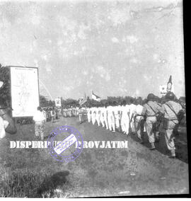 Rombongan barisan kontingen pembawa bendera PON selian dari pemuda juga dari angkatan bersenjata Penyerahan bendera PON di Surabaya untuk persiapan PON ke IV yang diselenggarakan di Makasar, 12 – 9 – 1957