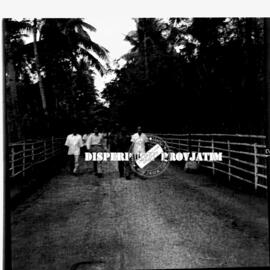 Item VI.60.2971 - Rombongan tim kebersihan ketika melintas di jalanan desa yang terlihat rapi dengan kiri kanan dipagari bilah bambu saat peninjauan Tim Kebersihan Nasional ke Malang, Blitar dan Kediri, 25 – 7 – 1960