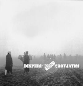 Samar-samar terlihat orang suku tengger berjalan di lautan pasir untuk menjalani upacara Kasada, 24 – 6 – 1956