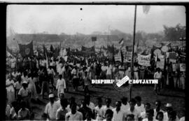 Sambil membawa spanduk dan slogan-slogan masa dengan tertib mengikuti jalannya rapat raksasa (PNI, PKI, NU) di Surabaya dengan tertib, 27 – 2 – 1955