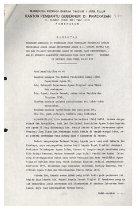 Sambutan pembantu Gubernur di Pamekasan pada pembukaan pertemuan safari pendidikan agama Islam Depag RI dengan kantor dan pejabat Depag se Madura yang diselenggarakan dipendopo Kab. Pamekasan pada tgl 25 Oktober 1986