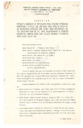 Sambutan pembantu Gubernur di Pamekasan pada upacara pembukaan penataran P.4 pola 120 jam bagi para Perwira ABRI / para Dosen / Para Pendidik dan tokoh - tokoh masyarakat untuk angkatan yang ke IX, yang diselenggarakan di pendopo Kab. Sampang pada hari Selasa tgl 5 Februari 1985