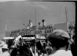 Sebuah panggung / podium dengan seorang pejabt sedang berpidato dengan spanduk bertuliskan KUATKAN PERSTUAN NASIONAL UNTUK REBUT IRIAN BARAT pada rapat raksasa (PNI, PKI, NU) di Surabaya, 27 – 2 – 1955
