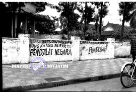 Sebuah plakat yang menentang konsepsi Bung Karno (Presiden Sukarno) dengan tulisan “setuju konsepsi bung karno berarti penjilat negara” dan disampingnya bertuliskan “laksanakan konsepsi bung karno” di Surabaya, tahun 1957