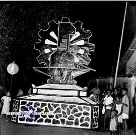 Sebuah tugu dari bambu yang dilapisi kertas semen dan dicat hitam putih, dengan bertuliskan 1 MEI, pada malam peringatan hari buruh di Surabaya, 1 – 5 – 1953.