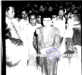 Semaun tengah memberikan sambutan saat kedatangannya di Surabaya, (lahir di desa Curah malang, Sumobito, Jombang, tahun 1899 dan wafat tahun 1971) adalah Ketua Umum Pertama Partai Komunis Indonesia (PKI) (wikipedia), 5 – 12 – 1956