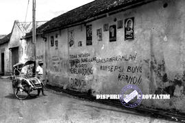 Seorang abang becak tengah mengamati plakat-plakat tentang konsepsi Bung Karno (Presiden Sukarno) di Surabaya, tahun 1957