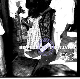Seorang anak perempuan sedang ditimbang setelah selesai di periksa oleh petugas kesehatan di Kepulauan Gili Raja Kabupaten Sumenep, 14 – 7 – 1956