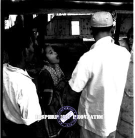 Seorang anggota tim kesehatan sedang memberikan vitamin/imunisasi kepada seorang anak perempuan dalam rangka layanan pengobatan kepada masyarakat di Pulau Sapeken, tahun 1957