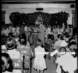 Seorang derigen sedang memimpin group paduan suara pada acara peringatan Hari Kartini di Pendopo Kabupaten Surabaya, 21 – 4 – 1954