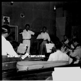 Seorang derigen sedang memimpin sebuah orkestra, dalam acara lomba nyanyi siswa sekolah lanjutan di surabaya, 22 – 12 – 1953