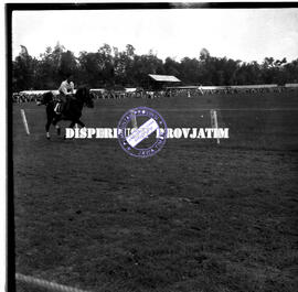 Seorang joki tengah memacu kudanya dalam lomba pacuan (patjuan) kuda di jombang (djombang) jawa timur, 26 – 8 – 1956