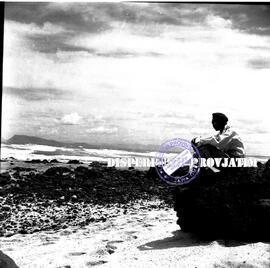 Seorang laki-laki duduk diatas bongkahan batu tengah menikmati keindahan pantai blambangan, 2 s.d 5 – 5 – 1956
