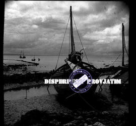 Seorang nelayan diantara dua perahun tradisional di pinggir pantai Kepulauan Gili Raja Kabupaten Sumenep, 14 – 7 – 1956