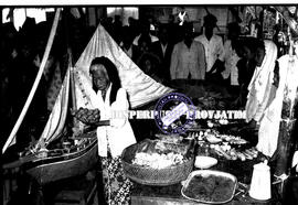 Seorang nenek sednag memasukan rangkaian sesaji ke dalam sebuah replika kapal yang akan dilarung pada acara sedekah laut di Muncar Banyuwangi, 28 – 1 – 1956