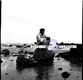 Seorang orang lelaki tengah duduk santai diatas batu sambil menikmati keindahan pantai blambangan, 2 s.d 5 – 5 – 1956