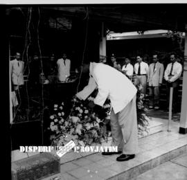 Seorang pejabat sedang meletakkan karangan bunga pada peringatan Hari Kebangkitan Nasional, di Grahadi Surabaya, 20 – 5 – 1959