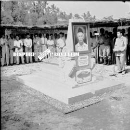Item VI.60.2931 - Seorang pejabat sedang memberikan sambutan pada peresmian pemugaran makam Pak Mujair, terlihat para panitia berada di belakang (Mbah Moedjair atau Pak Mujair yang bernama asli Iwan Dalauk, adalah seorang warga Blitar yang pertama kali menemukan dan membudidayakan ikan mujair pada tanggal 19 Maret 1936. Wikipedia) di Desa Papungan Blitar, Pada tahun 1960, atas inisiatif Departemen Perikanan Indonesia, makam beliau dipindah ke area khusus di selatan Desa Papungan, yang juga berfungsi sebagai makam keluarga, tahun 1960