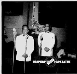 Seorang pejabat sedang memberikan sambutan pada resepsi jamuan makan malam menyambut kedatangan klub sepak bola Lokomotif Rusia, 19 – 11 – 1955