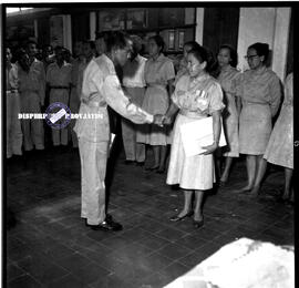 Item VI.64.3525 - Seorang pejabat sedang memberikan ucapan selamat atas penganugerahan bintang gerilya kepada Bu Darsih pegawai kantor Keresidenan Surabaya, 10 – 11 – 1964