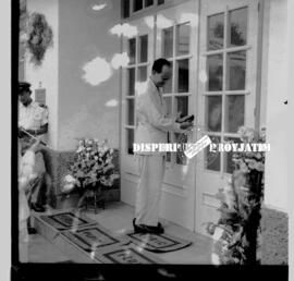 Seorang pejabat sedang membuka pintu sebuah rumah pada peresmian pemugaran makam Pak Mujair, terlihat para panitia berada di belakang (Mbah Moedjair atau Pak Mujair yang bernama asli Iwan Dalauk, adalah seorang warga Blitar yang pertama kali menemukan dan membudidayakan ikan mujair pada tanggal 19 Maret 1936. Wikipedia) di Desa Papungan Blitar, Pada tahun 1960, atas inisiatif Departemen Perikanan Indonesia, makam beliau dipindah ke area khusus di selatan Desa Papungan, yang juga berfungsi sebagai makam keluarga, tahun 1960