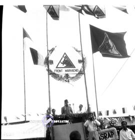 Seorang pejabat / tokoh sedang berpida di podium, tampak diatas podium logo PNI dengan bertuliskan Front Marhaens pada rapat raksasa PNI (partai nasional indonesia) di Surabaya, 30 – 1 – 1955