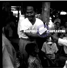Seorang pemilik kuda yang menjadi pemenang sedang menerima piala / trofi dalam lomba pacuan (patjuan) kuda di jombang (djombang) jawa timur, 26 – 8 – 1956
