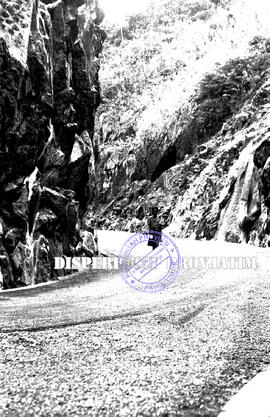 Seorang penduduk berjalan sendirian di jalan nasional lumajang – dampit, dengan kondisi jalan diapit tebing bebatuan di daerah semeru selatan kecamatan candipuro lumajang, 1956