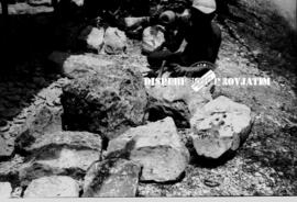Seorang pengrajin batu marmer sedang mengolah batu marmer dengan peralatan tradisional di Campur Darat Tulungagung, 1956
