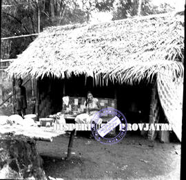 Seorang perempuan tengah duduk santai di depan balai-balai gubuk di blambangan, 2 s.d 5 – 5 – 1956