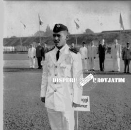 Seorang perwira dari Angkatan Laut yang menjadi komandan upacara pada upacara peringatan Hari Kemerdekaan Republik Indonesia di Lapangan Tugu Pahlawan, Surabaya, 17 – 8 – 1960