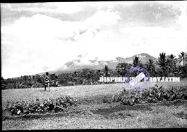 Seorang petani tengah membawa keranjang melintas di sebuah tanah lapang di senduro (senduro merupakan salah satu sentra penghasil pisang dan memiliki wisata kawah gunung bromo yang dikenal dengan B29 dan merupakan pedesaan tertinggi di jawa timur yang didiami penduduk), lumajang, 1956
