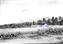 Seorang petani tengah membawa keranjang melintas di sebuah tanah lapang di senduro (senduro merupakan salah satu sentra penghasil pisang dan memiliki wisata kawah gunung bromo yang dikenal dengan B29 dan merupakan pedesaan tertinggi di jawa timur yang didiami penduduk), lumajang, 1956