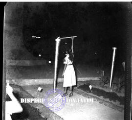 Seorang remaja putri sedang menyalakan  obor di dekat tugu pahlawan pada malam  pekan Irian Barat di Surabaya, 27–10 – 1957