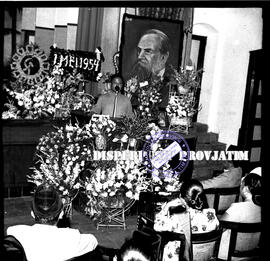 Seorang tokoh sedang berpidato pada malam peringatan hari buruh di Surabaya, dengan latar belakang simbol palu arit dan foto lenin, 1 – 5 – 1954