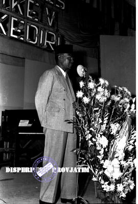 Seorang tokoh sedang memberikan sambutan pada Kongres Pelajar Islam Indonesia (PII) ke V di Kediri, 22 – 2 – 1954
