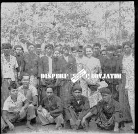 Seorang turis asing perempuan sedang foto bersama dengan sekelompok orang laki-laki suku tengger pada Kasada, 24 – 6 – 1956