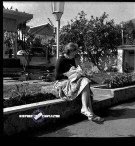 Seorang turis macanegara sedang duduk di depan Hotel Tanjung, foto diambil pada kegiatan Promotion Tour di Prigen, Tretes, 10 – 9 – 1969