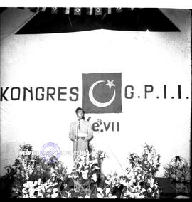 Seseorang sedang memberikan sambutan pada Konggres GPII (Gerakan Pemuda Islam Indonesia) ke VII di Surabaya, 19 – 2 – 1955