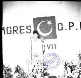 Seseorang sedang memberikan sambutan pada Konggres GPII (Gerakan Pemuda Islam Indonesia) ke VII di Surabaya, 19 – 2 – 1955