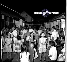 Suasana anak-anak sedang mengikuti lomba di sebuah perkampungan dalam malam peringatan HUT Kemerdekaan RI ke 8 di Surabaya, 17 – 8 – 1953