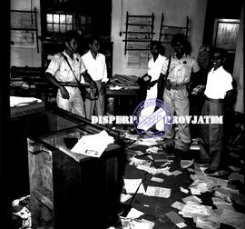 Suasana dalam ruangan kantor koran Jawa Post / Chinese Daily News yang berantakan, di Surabaya, 31 – 1 – 1956