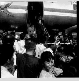 Item VI.64.3496 - Suasana kedatangan regu Thomas Cup Ang Tjing Siang dan Tan Joe Hok ketika turun dari pesawat di lapangan terbang Morokrembangan ketika melintas di Jalan Tunjungan Surabaya, 21 – 5 – 1964