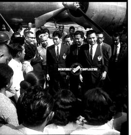 Suasana kedatangan regu Thomas Cup Ang Tjing Siang dan Tan Joe Hok ketika turun dari pesawat di lapangan terbang Morokrembangan Surabaya, 21 – 5 – 1964