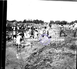 Suasana kerja bakti sukarelawan Pemuda Rakyat Surabaya menyambut Kongres Nasional ke VI Pemuda Rakyat di bawah koordinator Departemen PETERA Perwakilan Jawa Timur di Kaliwaron Surabaya, 24 – 7 – 1960