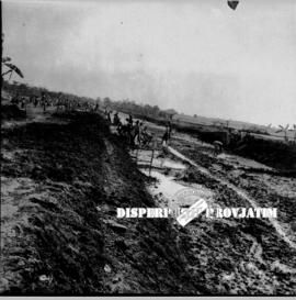 Suasana kerja bakti sukarelawan Pemuda Rakyat Surabaya menyambut Kongres Nasional ke VI Pemuda Rakyat di bawah koordinator Departemen PETERA Perwakilan Jawa Timur di Kaliwaron Surabaya, 24 – 7 – 1960