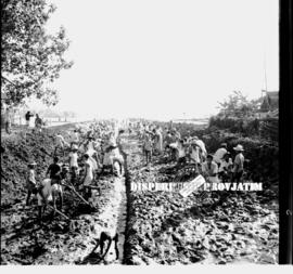 Suasana kerja bakti sukarelawan Pemuda Rakyat Surabaya menyambut Kongres Nasional ke VI Pemuda Rakyat di bawah koordinator Departemen PETERA Perwakilan Jawa Timur di Kaliwaron Surabaya, 24 – 7 – 1960