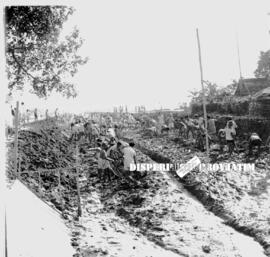 Suasana kerja bakti sukarelawan Pemuda Rakyat Surabaya menyambut Kongres Nasional ke VI Pemuda Rakyat di bawah koordinator Departemen PETERA Perwakilan Jawa Timur di Kaliwaron Surabaya, 24 – 7 – 1960